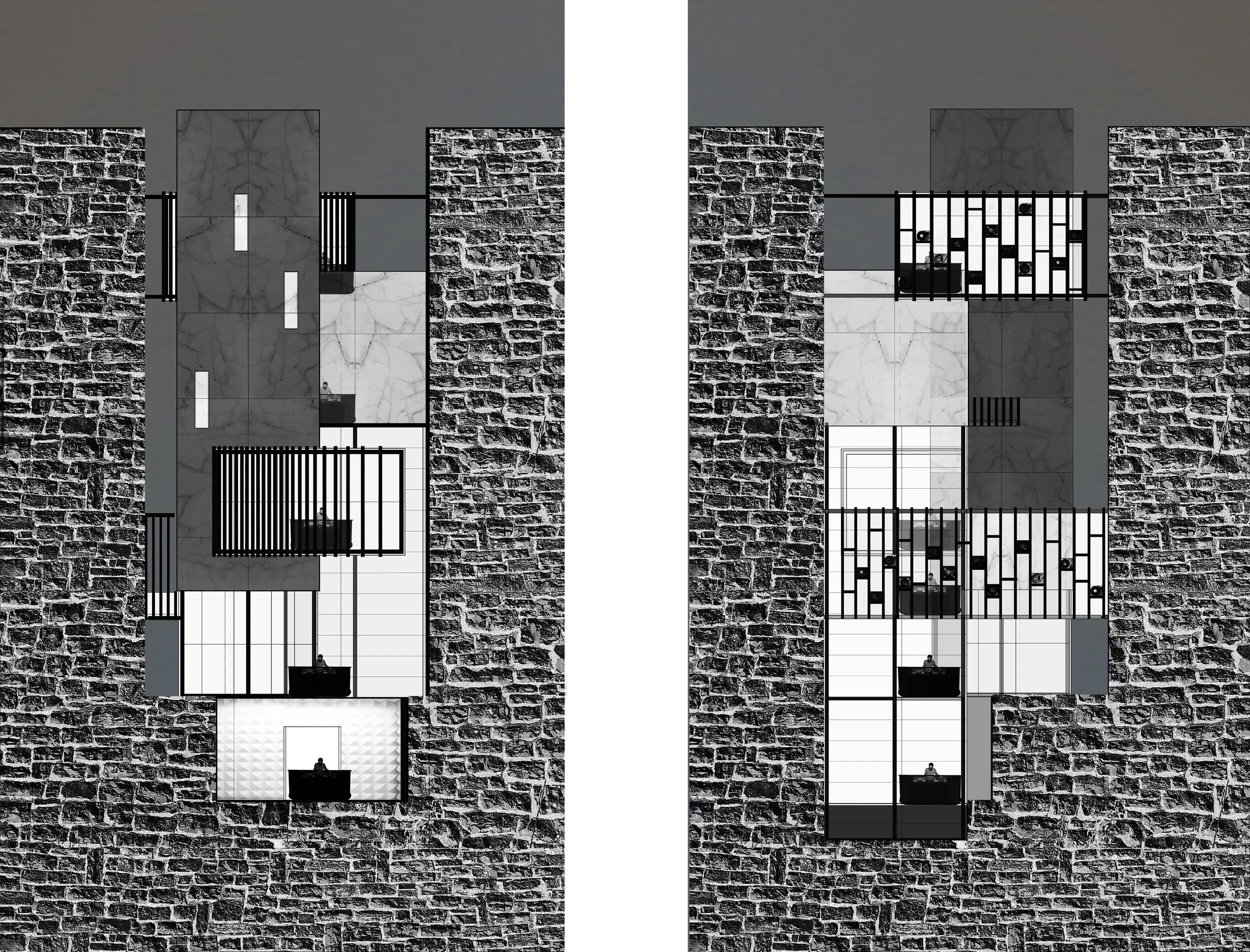 These towers interact through the attachment of shared wooden galleries which behave in reference to the medieval tower typology prevalent on the site. While the wooden attachments no longer exist in their intended form, there are clues of their previous existence through beam gaps on the façade of the tower across the street and the cemented permanence of the Vassari corridor. These galleries act as outdoor spaces, office and managerial suite, and living and kitchen area. Prominent wooden ribs frame each gallery, while a wooden screen is punctured by rhythmic glass boxes that hold the turntables. These turntables are attached to adjustable shelves that enable them to turn up as integrated members of the façade, or rotate down perpendicularly to enable usage of the turntables. The gallery wall is an activating library for the twins’ turntables collection.